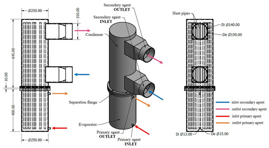 This equipment comprises two distinct zones: the evaporator and the condenser. To ensure complete segregation of the two fluid streams, a separating flange is strategically placed between the two zones, preventing cross-contamination. Inside the heat recovery unit, a set of fourteen vertically oriented heat pipes acts as a highly effective heat conductor, optimizing heat transfer from the heat source. The evaporator, condenser, and separation flange are made of stainless steel and the heat pipes are made of copper. Utilizing water as the working fluid, these gravitational heat pipes have been designed and optimized through extensive experimental testing [36]. Detailed construction specifications of the heat recovery unit can be found in Table 1.