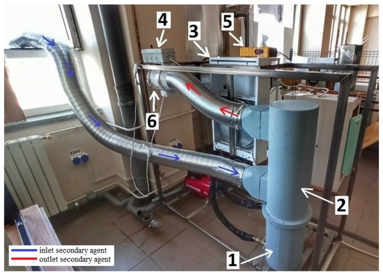 The laboratory experimental stand: 1—Evaporator, 2—Condenser, 3—Electric heater, 4—Fan speed control switch, 5—LT BTM-420SD electronic thermometer, 6—Fan.