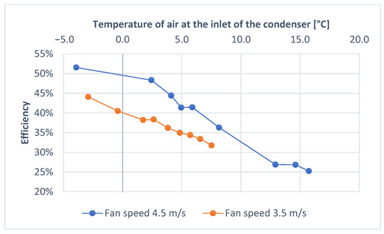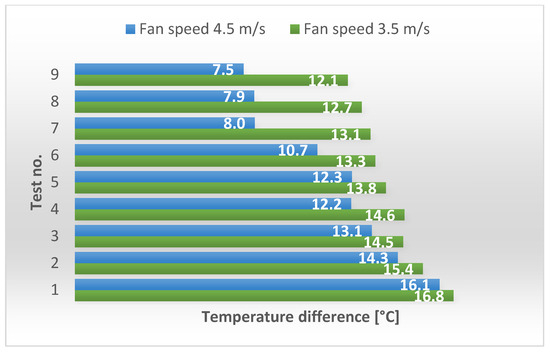 The findings are presented in Figure 4. The influence of external air temperature on the heat exchanger’s efficiency is less pronounced at lower fan speeds compared to scenarios with higher air velocity. Notably, during tests 7, 8, and 9, it was observed that the effectiveness of the equipment drops to 25–27% when the external air temperature is higher, within the range of 13–15 °C.
