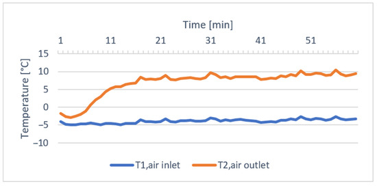 Figure 5 illustrates the performance of the equipment under its most efficient scenario during test 1 when the fans speed is 4.5 m/s. T1,air inlet represents the temperature of the air at the inlet of the condenser while T2,air outlet represents the air temperature at the outlet of the condenser. It is notable that, after approximately 15 min, the air temperature at the outlet of the equipment reaches a state of stability, characterized by a constant value. Furthermore, the average temperature difference between the outlet and inlet remains at 12.23 °C.