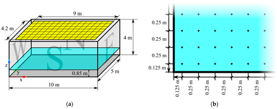 Besides the walls, floor, and ceiling of the model room, a reference plane was used. In this specific case, the reference plane represented the work surfaces of the room, i.e., top surfaces of desks used in the room. Since the placements of desks were ignored in this project, which is an approach often used in lighting system designs, the horizontal reference plane filled the whole model room 0.85 m above the floor, as suggested in standard [5]. The model room configuration is shown in Figure 1, where Figure 1a shows the dimensions of the room, and Figure 1b details the reference plane and the measurement points for calculation.