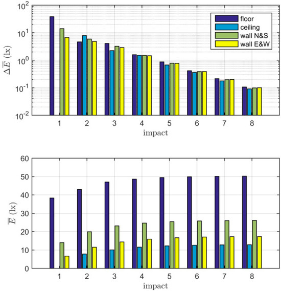 The rendering algorithm radiosity has been implemented to be used by the genetic algorithm for the objective function feedback, calculating the given luminaire layout design’s quality. As radiosity is an application of the finite element method, the model room’s surfaces had to be divided into smaller facets (rectangular facets of dimensions 0.2 m × 0.2 m were used). These were used by our implemented radiosity method for spacial luminous flux distribution calculations, including six reflections. The number of reflections was limited to six after several radiosity test runs using only a single luminaire of type MSTR SLB 4 × 18W (exported from software BuildingDesign–Wils library [25]) placed in the model room in the center of the ceiling for illuminances of the facets were affected by less than 10% using more than six reflections by the algorithm. The radiosity reflection test run results are graphically shown in Figure 2. The first part of figure shows the differential increase in the mean illuminance of the individual surfaces with each reflection, and the second part shows the total mean illuminance of the individual surfaces after each reflection.