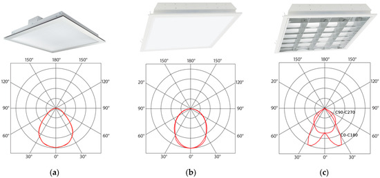 A rectangular grid of evenly spaced control points—used for illuminance calculations—was placed on the reference plane with 25 cm distances between neighboring points (Figure 1b). Luminaires were placed in the plane of the model room’s raster ceiling starting 0.5 m from the eastern and western wall, and 0.4 m from the northern and southern wall, as depicted in Figure 1a, with available positions spaced 0.6 m apart. Three luminaire types were used in this project from the manufacturer Trevos, i.e., TT LED, PSV PISA T8 OP, and PSV PISE T8 PAR (Figure 3), all being designed for a 600 × 600 mm gypsum or raster ceiling. All placed luminaires were oriented identically, with their planes C0°–C180° [26] parallel to the room’s y-axis, as depicted in Figure 1a.