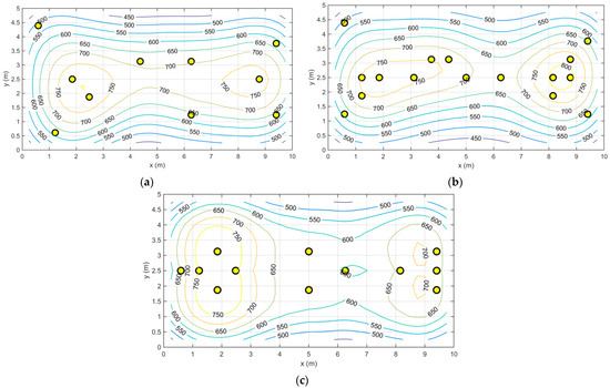 Top–down view of the model room with black–yellow circles representing luminaire positions in the ceiling plane and isolux diagram of the reference plane (initial illuminance values): (a) TT LED; (b) PSV PISA SDK T8 OP; (c) PSV PISA SDK T8 PAR.