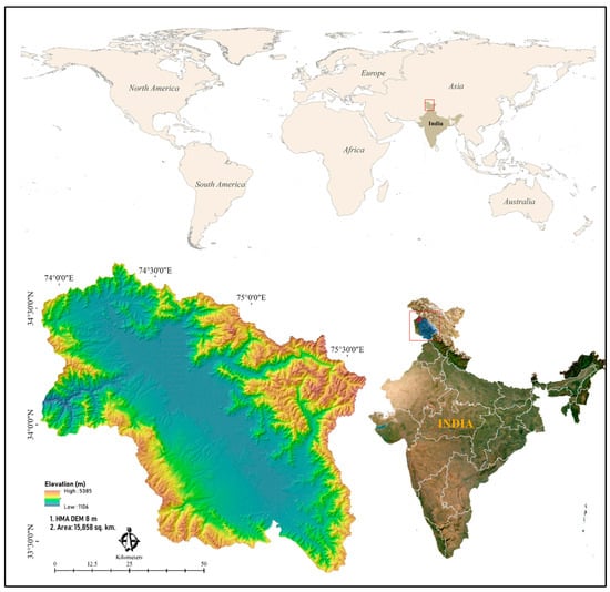The study area (Kashmir Valley), is located in the far north-western corner of the country, within the northernmost state of India, Jammu and Kashmir. The valley is elliptical and bowl-shaped, stretching between 32°22′–34°43′ N latitude and 73°52′–75°42′ E longitudes, covering an area of 15,948 square kilometers at an altitude of 1577 m above mean sea level (Figure 1). Surrounded by the Himalayan ranges, the region exhibits the characteristics of a semi-closed ecosystem and is drained by the river Jhelum, a tributary of the larger Indus. The Kashmir Valley experiences a temperate climate, which is suitable for both horticultural and agricultural crops. The valley receives 60% of its annual precipitation in the form of rain and snow during December and January. The temperature varies significantly from the valley floor to the rim region, often decreasing with elevation. This variation contributes to the highly varied temperature and precipitation conditions at the meso and micro scales.