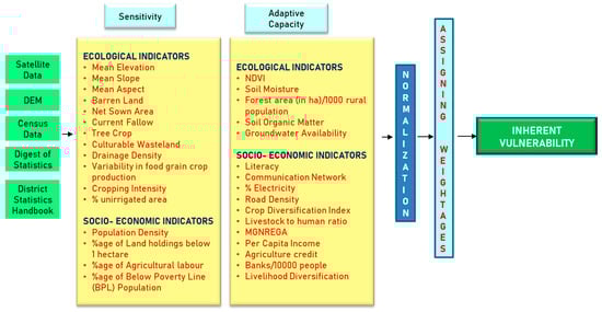 The Inherent Vulnerability Index has been calculated by utilizing an indicator-based approach as a function of sensitivity and adaptive capacity. When creating a composite index, it is crucial to use indicators/variables that accurately represent the fundamental concept, as this will ensure the validity of the vulnerability index [31,32]. The selection of indicators for this study was based on the availability of data across time and space (districts), a review of the pertinent literature, and consultation with experts in agriculture, water resources, and climate change. A set of 32 indicators pertaining to ecological (biophysical) and socioeconomic variables were divided into sixteen indicators of sensitivity and sixteen measures of adaptive capacity. The rationale for use and derivation methods are described below and summarized in Figure 2.