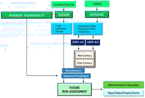 Over the Indian region, bias correction was carried out using IMD’s gridded rainfall and temperature datasets. The future analysis was carried out for two Shared Socioeconomic Pathways (SSP), viz., SSP2-4.5 (“middle of the road”) and SSP5-8.5 “fossil-fueled development” [39,40,41]. Districtwise composite exposure was calculated using Equation (6).