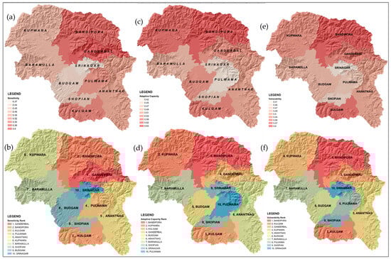 Respective range and ranking of (a,b) sensitivity, (c,d) adaptive capacity, and (e,f) vulnerability.
