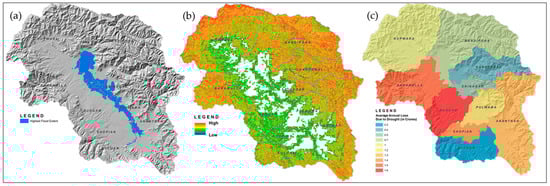 Spatial representation of the (a) flood hazard, (b) landslide hazard, and (c) drought hazard area of the Kashmir Valley.