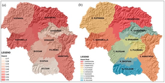 Spatial representation of the (a) hazard index and (b) hazard ranking of the districts of Kashmir Valley.