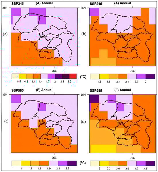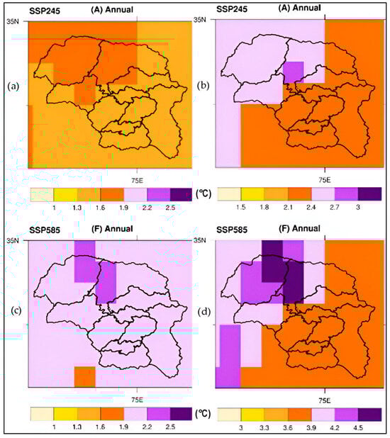 Spatial representation of the Tmin of the Kashmir Valley under the (a) SSP2-4.5 (MC) and (b) SSP2-4.5 (EC) scenarios and the (c) SSP5-8.5 (MC) and (d) SSP5-8.5 (EC) scenarios.
