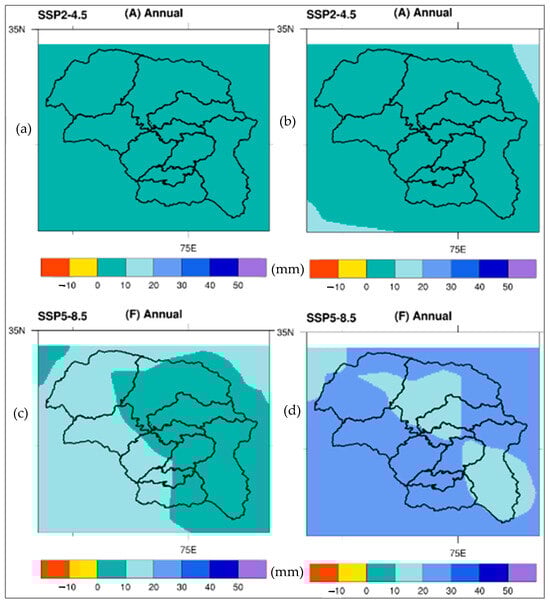 Spatial representation of the precipitation of the Kashmir Valley under the (a) SSP2-4.5 (MC) and (b) SSP2-4.5 (EC) scenarios and the (c) SSP5-8.5 (MC) and (d) SSP5-8.5 (EC) scenarios.