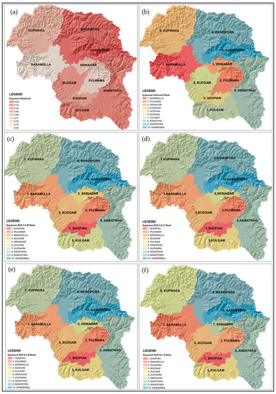 For SSP5-8.5 EC, District Shopian again has the highest exposure (0.948), followed by Baramulla (0.793), Pulwama (0.785), and Budgam (0.701). Districts Kulgam (0.665), Kupwara (0.652), and Srinagar (0.642) are moderately exposed, while districts Anantnag (0.270), Bandipora (0.033), and Ganderbal (0.007) fall in low-exposure zones (Figure 10f).