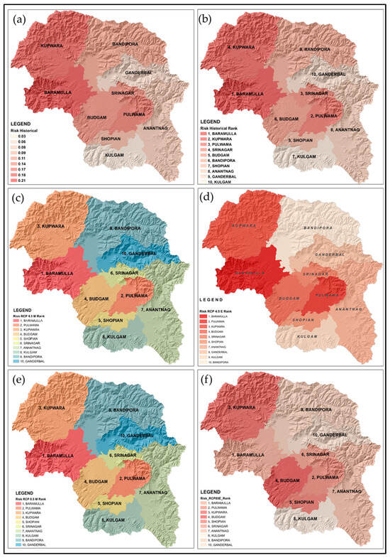 According to SSP5-8.5 MC, Baramulla has the highest risk (0.198), followed by Pulwama (0.174), Kupwara (0.159), Budgam (0.144), Shopian (0.124), and Srinagar (0.121). The Anantnag (0.069) and Kulgam (0.064) districts were moderately prone to risk. Bandipora (0.012) and Ganderbal (0.003) were least at the risk (Figure 11e).