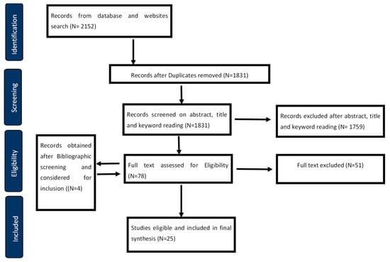 - In the final stage, the reference lists and bibliographies of the sources identified in the previous stages were thoroughly scrutinized to extract any additional relevant sources that may have been omitted in the previous stages. This supplementary reference list screening also helped to identify any relevant studies that were not indexed in the databases searched. The sources retrieved from all stages described above were considered relevant or irrelevant based on a pre-defined eligibility criterion (described in Section 2.1).