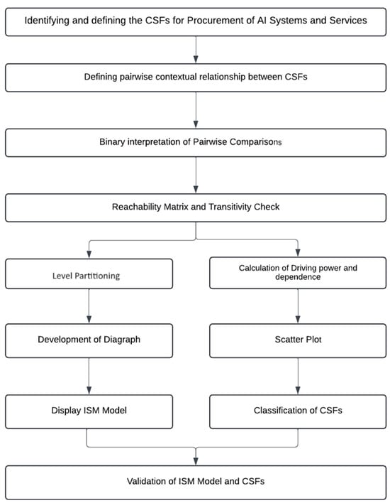 While research specifically focusing on ISM and AI procurement is limited, its application in exploring CSFs for complex projects holds significant advantages. AI procurement involves numerous interconnected factors, making it challenging to identify their relative importance and relationships. ISM provides a structured methodology for systematically analyzing pairwise comparisons of these CSFs, leading to a more comprehensive understanding []. By continuously refining the ISM model, it becomes possible to pinpoint CSFs that exert substantial influence on other factors, alongside dependent CSFs that are profoundly impacted by these influential factors []. This categorization helps prioritize efforts and resources during AI procurement. The expert-driven approach of ISM fosters collaboration and discussion among stakeholders involved in AI procurement. The pairwise comparisons encourage stakeholders to explicitly articulate their understanding of the relationships between CSFs, potentially leading to a more unified and informed decision-making process []. The final ISM model, typically presented as a digraph, provides a clear visual representation of the interrelationships among CSFs []. This transparency facilitates communication between stakeholders, ensuring everyone involved has a shared understanding of the key drivers and dependencies in the AI procurement process. By leveraging these advantages, ISM can be a valuable tool for identifying, prioritizing, and effectively managing the CSFs crucial for successful AI procurement within complex public sector environments. The ISM methodology involves five key steps: (1) Developing the structural self-interaction matrix (SSIM); (2) Creating the reachability matrix; (3) Partitioning of factors; (4) Classifying factors; and (5) Constructing the ISM.