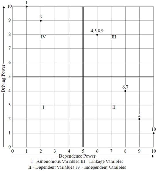 The summation across row 2, representing CSF C2, indicates its perceived driving power, while the summation across column 2 reflects its dependence. CSFs are graphed based on their driving power versus dependence and categorized into the four quadrants as illustrated in Figure 4. The autonomous components, or CSFs with modest driving and reliance capabilities, are represented by the first quadrant. CSFs which are weak drivers but naturally highly reliant make up the second quadrant. CSFs which have great driving and dependence power make up the third quadrant. The CSFs in this quadrant are referred to as unstable linkage elements because of the way they impact the system as a whole. The driving factors that have high driving but weak dependence capacities are represented by the fourth quadrant.