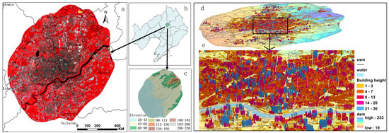 Study area. Panel (a) shows a false color composite map of Shenyang urban area derived from Sentinel-2 images. Panel (b) provides the geographical location. Panel (c) displays the elevation map. Panel (d) presents a three-dimensional map. Panel (e) offers an enlarged view of three-dimensional architecture.