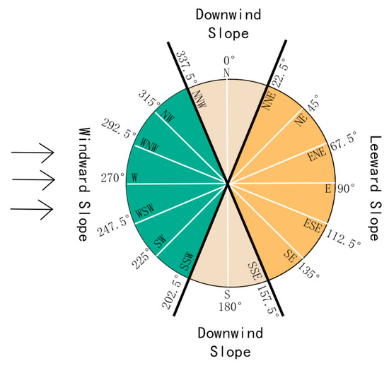The study area comprises the eastern extension of the Liaodong hills in the east, transitioning into plains in the central and western regions. These diverse terrains exhibit varying effects on wind patterns, resulting in differentiated wind speeds across the area. Slope, aspect, and slope position were derived from the DEM data to characterize the terrain conditions. The interpolated wind speeds were corrected by referencing the literature [31] that relates the wind speed ratios between different terrain features and flat surfaces (Table S2). Figure 2 illustrates the slopes corresponding to the prevailing westerly wind simulated within the study area.