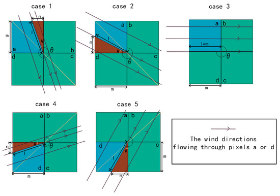 In this study, inlet vents are strategically located in the northwest, west, and southwest directions. The analysis considers five scenarios where wind diverges towards the downwind direction (Figure 3). Upwind pixels are cut by a wind line passing through the intersection of four pixels, with subsequent airflow dividing and flowing into neighboring pixels that share a common edge. The fraction of CO2 entering neighboring pixels is determined by the proportion of the area of the upwind pixel following segmentation.