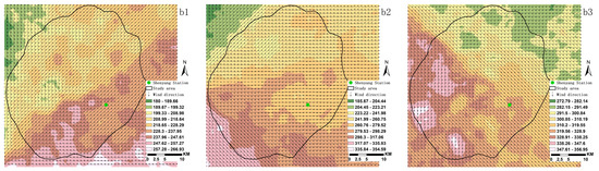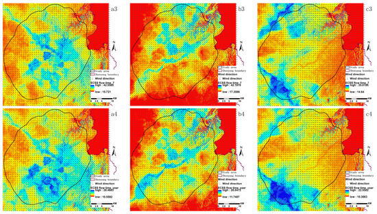 The prevailing wind directions from the southwest, west, and northwest were determined by interpolating the wind direction points distributed along the potential ventilation pathways (Figure 4b1–b3). The direction of the wind flows follows the trajectory of the respective potential ventilation paths, effectively addressing the westerly wind requirements in the study area and illustrating the impact of urban building distribution on wind patterns. Controlling the orientation of the air inlet allows the simulation of wind flow fields in various scenarios. This paper focuses solely on these three directions as examples.