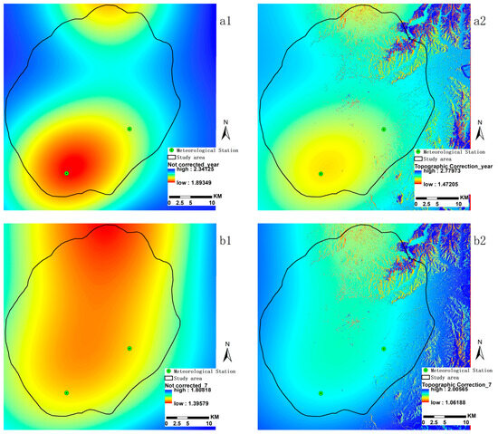 The distribution of the meteorological stations selected for this study is depicted in Figure S3. AAWS (Figure 5a1) and JAWS (Figure 5b1) were interpolated using Kriging methods. The AAWS ranges between 1.89 m/s and 2.34 m/s; thus, it is higher than the JAWS, which ranges from 1.40 m/s to 1.81 m/s. Both datasets indicate lower wind speeds in urban areas and higher speeds in suburban regions. Following correction for slope, aspect, and slope position (Figure 5a2,b2), the overall wind speed trends remained consistent. The AAWS ranged from 1.47 m/s to 2.79 m/s, and JAWS from 1.06 m/s to 2.01 m/s, with the maximum values increasing and the minimum values decreasing compared to the pre-correction levels. The areas exhibiting changes in wind speed are primarily located in the hills on the eastern side of the study area, where topography exerts a significant influence, resulting in noticeable local variations post-correction.