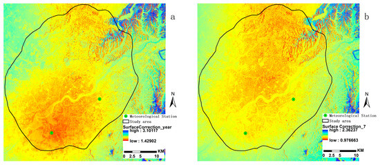 Kriging interpolation was applied to estimate the annual average wind speed (AAWS) and the July average wind speed (JAWS) at the meteorological stations. However, conventional Kriging interpolation methods typically only account for distance and direction in the horizontal plane, neglecting the impact of terrain undulations and building structures on wind speeds. To enhance the accuracy of wind speed across the study area, it is essential to conduct topographic and surface corrections of the interpolated wind speed data.