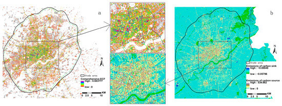 The spatial distribution pattern of carbon emissions from the construction land is similar to the comprehensive ECF (Figure 7b), with individual pixels showing that the highest carbon emission reached 534.662 t. The carbon emissions per pixel from the cultivated land, forest land, grassland, water area, and unused land are 0.04473 t, −0.05796 t, −0.00198 t, −0.02277 t, and −0.00045 t, respectively. Carbon sinks serve as the supply areas for ECSS, while carbon sources represent the demand areas. In the study area, the supply areas are small and sparsely distributed and offer limited carbon sequestration capacity per unit area. In contrast, the demand areas, such as urban regions, are larger and have a significantly higher demand for ECSS. Consequently, urban areas alone cannot sufficiently meet their carbon cycling needs.
