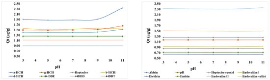 pH can influence the adsorption process by altering the charge and structure of the adsorbent material, as well as changes in the charge and structure of the pollutant molecules. pH can also affect the solubility properties of the pollutants, which can influence the adsorption capacity of the adsorbent material. Previous studies have shown that changing pH can have significant effects on the adsorption processes of organic compounds, such as dyes, pesticides, heavy metals, etc. In the case of organochlorine pesticide pollution, whose physicochemical properties differ significantly, it is important to investigate the influence of pH on the adsorption capacity for each individual compound.