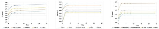 In the case of the organochlorine compounds Alachlor and Dieldrin, adsorption increased rapidly in the first four hours, reaching a plateau after only six hours of contact. These findings are in agreement with previous results in the literature and indicate that the removal of these compounds requires longer periods of time in order to be affected by the adsorption process [25,26,27,28].