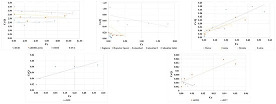 An analysis of the values of the Langmuir equation parameters for the adsorption of organochlorine pesticides on polystyrene particles shows a significant variation in the maximum adsorption capacity (Qmax), the Langmuir equilibrium constant (KL) and the correlation coefficient (R2) (Table 2). Values for Qmax ranging from 1.02 to 29.7 µg/g indicate a variable adsorption capacity of polystyrene particles for different types of organochlorine pesticides. Higher values of Qmax suggest that polystyrene particles have a high adsorption capacity for these pesticides, which may be useful in contaminated water treatment processes. The Langmuir equilibrium constant (KL) is important to determine how tightly pesticide molecules bind to the surface of polystyrene particles. Values between 0.0003 and 12.4 L/mg indicate a significant variation in the adsorption efficiency of polystyrene particles. Higher KL values indicate more efficient adsorption of organochlorine pesticides on polystyrene. The correlation coefficient (R2) is a measure of how well the Langmuir model fits the experimental data. Values between 0.0009 and 0.8389 indicate a large dispersion in the fit of the Langmuir model to the experimental data. Lower R2 values indicate that this model does not fit the experimental data perfectly and more complex models or additional adjustments may be needed to correctly describe the adsorption process.