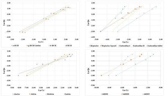This suggests that the sorption process is characterized by a heterogeneous distribution of sorption sites on the adsorbent surface, implying that the energy of adsorption varies across different sites [26,29]. Consequently, the adsorption of OCPs onto PS is not confined to a single layer, which is consistent with the multifaceted interactions that can occur in complex environmental matrices. The Freundlich model is particularly suitable for systems where the surface properties are uneven, allowing for variations in the energy of adsorption. As such, the findings highlight the complexity of the sorption dynamics in contaminated environments, emphasizing that multiple factors influence the extent and nature of the adsorption processes for MPs on various pollutant substrates. This information can be critical for understanding the behavior of MPs in the environment and their potential to absorb and transport hazardous contaminants.