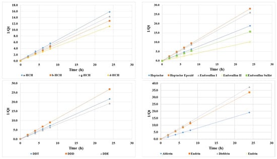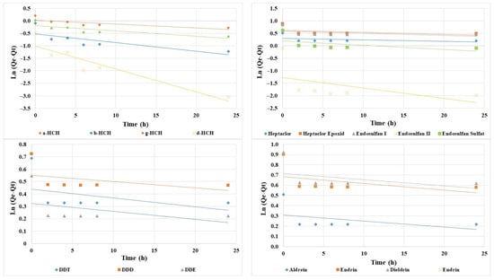In contrast, the adsorption capacity values determined by the pseudo-order I model were between 0.28 and 2.04 µg/g and showed some discrepancies from the directly calculated values (Table 2). These discrepancies between the calculated values and those obtained by kinetic models can be attributed to the fact that the pseudo-order I model is less suitable for the study of adsorption of organochlorine pesticide-contaminated water on polystyrene particles. This kinetics model assumes a dependence on the initial concentration and may underestimate the adsorption capacity for lower concentrations.