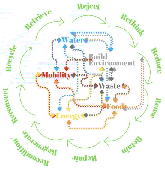 Figure 1 shows the dependency cycle of six systems identified as key urban sectors and the framework in which best practices and actions are positioned concerning the 10R model (Refuse, Rethink, Reduce, Reuse, Recontain, Repair, Recondition/Regenerate, Repurpose, Recycle, and Recover) [44].