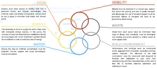 The emergence of the circular economy and its various applications to urban issues has led to the need to identify key priority sectors to study their supply chains and define closed and regenerative cycles. This is carried out with a sustainable vision, addressing “the needs of the present without compromising the ability of future generations to meet their own” [12] and realizing “circular cities.” According to the Circular City Declaration [13], a “Circular City” must adhere to all the principles of the circular economy, namely reduction, reuse, and recycling of resources. Generally, a circular city is characterized by the following elements: