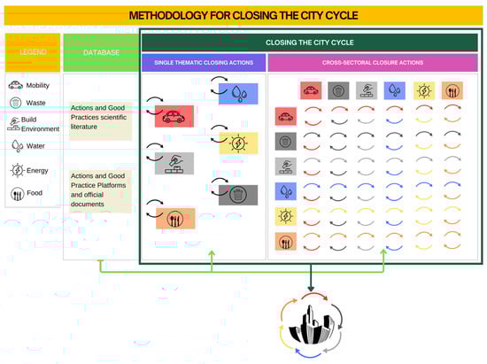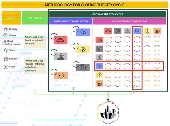 The developed research aims to define a strategic framework for identifying intersectoral circular actions to achieve the overall closure of the urban cycle of a city. The defined actions need to be integrated into a synergistic framework to create an effective circular urban system addressing all key sectors. For instance, rainwater recovery can be used to irrigate green areas, which in turn can help foster a local market, reduce air pollution, and improve air quality. To close the urban life cycle, it is necessary first to close the cycle of individual priority sectors in a city (Mobility, Waste, Built Environment, Water, Energy, Food) and then propose interrelations among them. However, it should be noted that to achieve the closure of the urban cycle, this framework of circular actions must generally be included in a broader strategic framework, such as an Urban Circular Action Plan [43].
