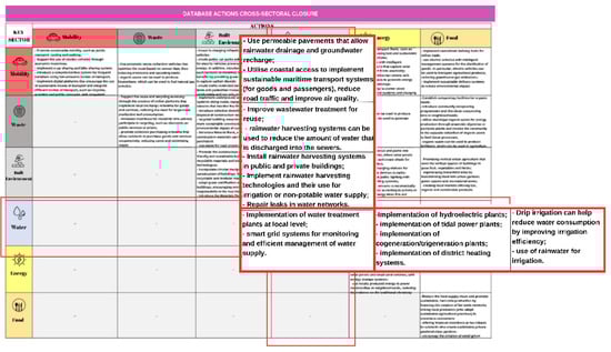 Table A1 in Appendix A shows an excerpt from the strategic framework of intersectoral actions provided in the methodology and prepared in Excel, while Figure 4 shows a focus on the Water key sector that will later be used in the application of the methodology to a first case study.