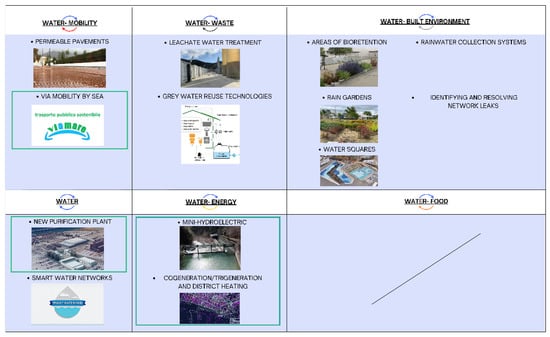 In addition to water cycle closure, it is crucial to consider the intersectoral nature of various issues to achieve overall urban cycle closure, as mentioned earlier. The following actions are proposed to meet this requirement, summarized schematically (Figure 6, actions already planned in green frames), investigating and proposing actions related to intersectoral issues: Water–Mobility, Water–Waste, Water–Built Environment, and Water–Energy.