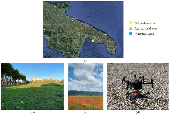 The surveys were carried out in areas where there were no methane emissions; in particular, the chosen areas are in Apulia (Italy) (Figure 1a) and are represented by: