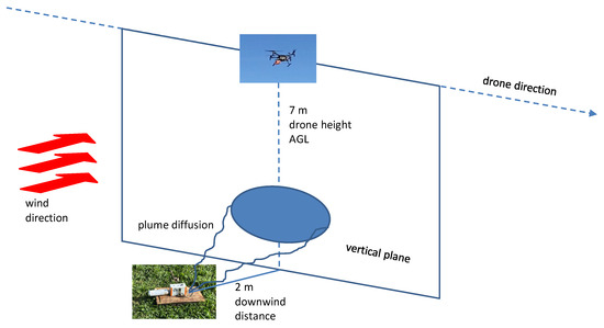 Figure 2 shows the scheme used to carry out the controlled methane release test. The CH4 flow was kept at the maximum possible for the flowmeter used, i.e., at 80 Lh−1 (~3 standard cubic feet per hour—SCFH), while the flight was carried out downwind at a height of 7 m AGL and at a horizontal distance from the release point of 2 m; the UAV speed was 1 ms−1 and the data acquisition frequency set to 10 Hz (this gives a spatial resolution of 0.1 m).