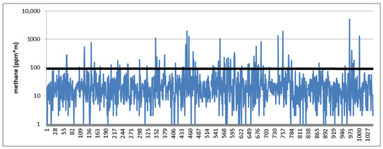 Various factors can affect the sensor’s ability to carry out a correct measurement and, therefore, in every test the presence of a certain number of outliers is found which must be eliminated with specific correction algorithms. It should be noted that some TDLAS sensors exhibit this behavior and, therefore, the problem of identifying outliers arises. In these cases, the application of a correction algorithm can be useful. Figure 3 reports the measurements on a logarithmic scale, in chronological order, of one of the flights carried out for background measurement at a height of 10 m AGL and at a drone speed of 2 ms−1 in Survey n. 1; the presence of several methane peaks can be noted, which certainly represent sensor reading errors which sometimes exceed 5000 ppm*m.