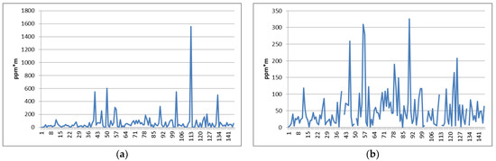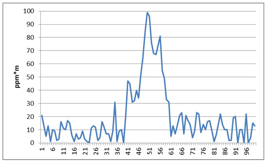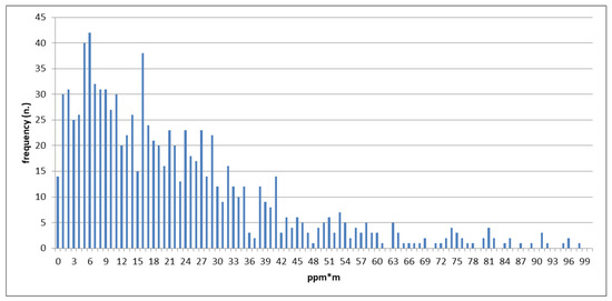 For the purposes of subsequent analyses, incorrect readings must be identified and deleted; to this end, a procedure was adopted which in an iterative process uses a threshold of 2σ above the mean to eliminate false positives [27]. The black line in Figure 3 represents the threshold above which the values are considered outliers (98 ppm*m).