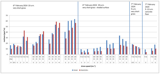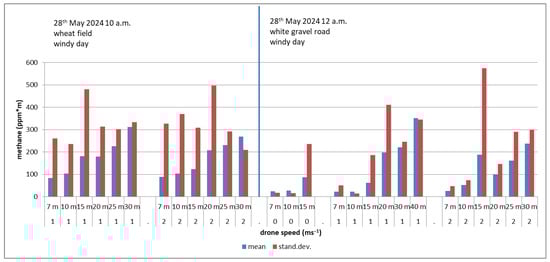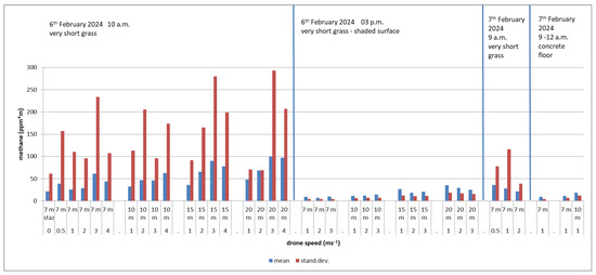Figure 6 shows the processed methane background data measured in the various tests performed in the suburban area; the figure shows for each test the mean and standard deviation of the concentrations detected during the survey. The parameters that vary are the flight altitude and the drone speed as well as the time of execution of the survey and the type of surface flown over. It can be noted that in many cases the standard deviation exceeds the mean, indicative of a strong variability of the measurements due to the presence of many outliers.