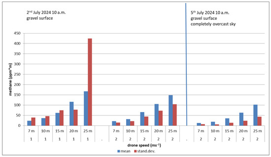 Figure 9 and Figure 10 show the methane background indicators referring to the tests performed in the AA and IA, respectively. As already reported, in the tests carried out in the campaigns following the first one, it was decided to repeat the flights only at the UAV speeds of 1 and 2 ms−1, as well as when hovering. This choice was derived from the analysis of the data obtained in the first tests.