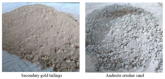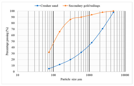 The particle size distribution of the secondary gold tailings and andesite crusher sand.