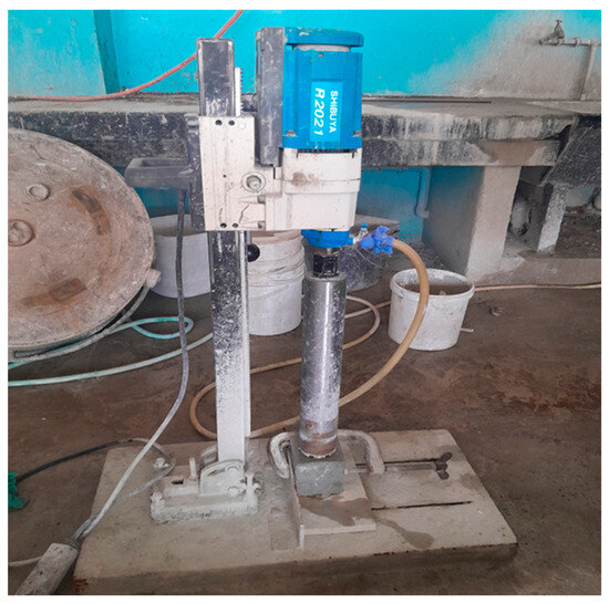 Durability tests were conducted on the specimens, based on the South African durability index (DI), namely, oxygen permeability, water sorptivity, and chloride conductivity. The DI assessed the quality of the concrete specimens regarding the transport of gas, moisture, and chloride after 28, 56, and 90 days of curing, complying with South African standards for the procedures [45]. Concrete discs with a diameter of 70 ± 2 mm and a thickness of 30 ± 2 mm cut from 100 × 100 × 100 mm3 specimens were used for the three tests. The preparation of concrete discs from a concrete sample is shown in Figure 3. Four concrete discs from each mixture proportion at each curing day were tested for each DI test. The average values of each DI measurement were recorded as the test results. The concrete discs were subjected to a temperature of 50 ± 2 °C for 7 days in the oven and cooled to 23 ± 2 °C before being used for the tests. Four specimens per mixture proportion were tested for each DI after each curing age.