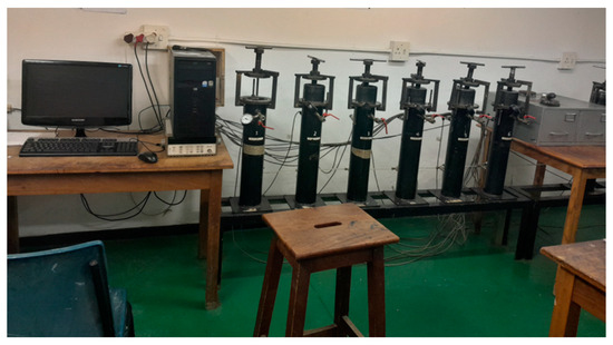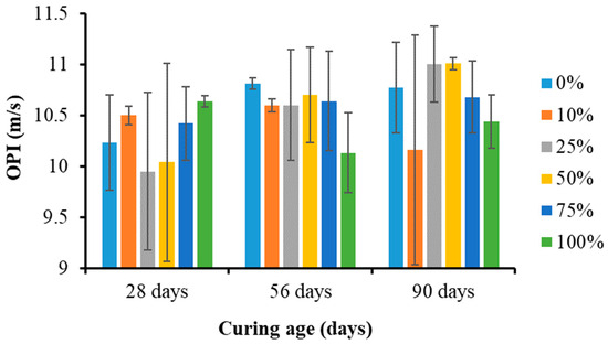 The oxygen permeability index test was carried out after each curing age, in conformity with South African standards [45]. Figure 4 shows oxygen permeability index testing. Each concrete disc was placed in the permeability cell, and oxygen was released into the cell until the pressure in the cell reached 100 ± 5 kPa. Subsequently, the data logging devices automatically recorded the pressure value at 15 min intervals until the pressure in the cell was reduced to 50 ± 2.5 kPa or until 6 h ± 15 min had elapsed. Based on the pressure and time results, oxygen permeability was calculated as the negative logarithm of the coefficient of permeability [45].