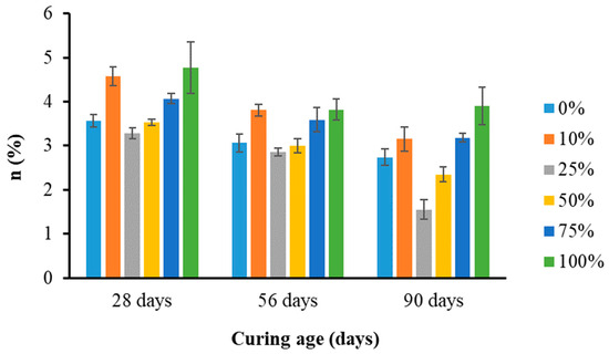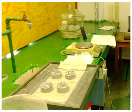 The water sorptivity index test assessed the concrete’s porosity and water absorption rate after each curing age, in conformity with South African standards [45]. Water sorptivity index testing is presented in Figure 5. The concrete discs were sealed at the curved sides, weighed, and the measurements recorded. Afterward, the discs were placed on paper towels in a tray containing calcium hydroxide solution at 23 ± 2 °C. The unsealed face in contact with the solution was limited to a 2 mm height above the disc side. The discs were periodically weighed at 3, 5, 7, 9, 12, 16, 20, and 25 min intervals within 10 s of their removal while still in a saturated and dry-surface condition. The concrete discs were vacuum sealed at 75 kPa for 3 h ± 15 min, followed by soaking in calcium-saturated water for 1 h ± 15 min with no air penetration in the vacuum saturation tank, restoring the vacuum to 75 kPa. The vacuum was released, and the specimens were soaked in the air that penetrated the tank for 18 ± 1 h. Then, the specimens were saturated dry and weighed. The porosity of each concrete disc was calculated using Equation (2):