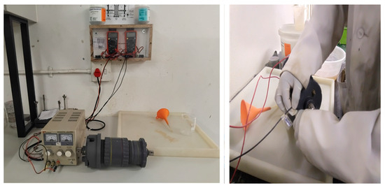 The chloride conductivity index test assessed concrete porosity and chloride diffusion after each curing age, in conformity with South African standards [45]. The chloride conductivity testing of a concrete sample is shown in Figure 6. Concrete discs were sealed in vacuum saturation at 75 kPa for 3 h ± 15 min. After that, the specimens were immersed in sodium chloride (NaCl) for 1 h ± 15 min without air exposure in the vacuum saturation tank, restoring the vacuum to 75 kPa. The vacuum was released, and the specimens were soaked in air that penetrated the tank, for 18 ± 1 h. Then, the specimens were saturated dry, weighed, and placed in a chloride cell with 5 M NaCl in both chambers consecutively. Using a 10 V DC power supply, current and voltage were measured simultaneously via an ammeter and voltmeter. The chloride conductivity for each disc was calculated using Equation (4) [45]: