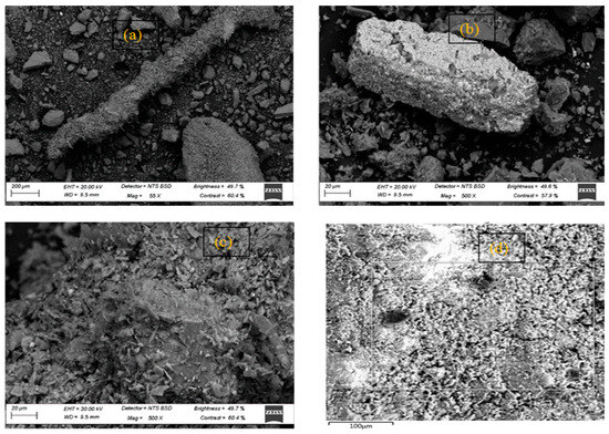 SEM image of (a–c) the secondary gold tailings and (d) the crusher sand.
